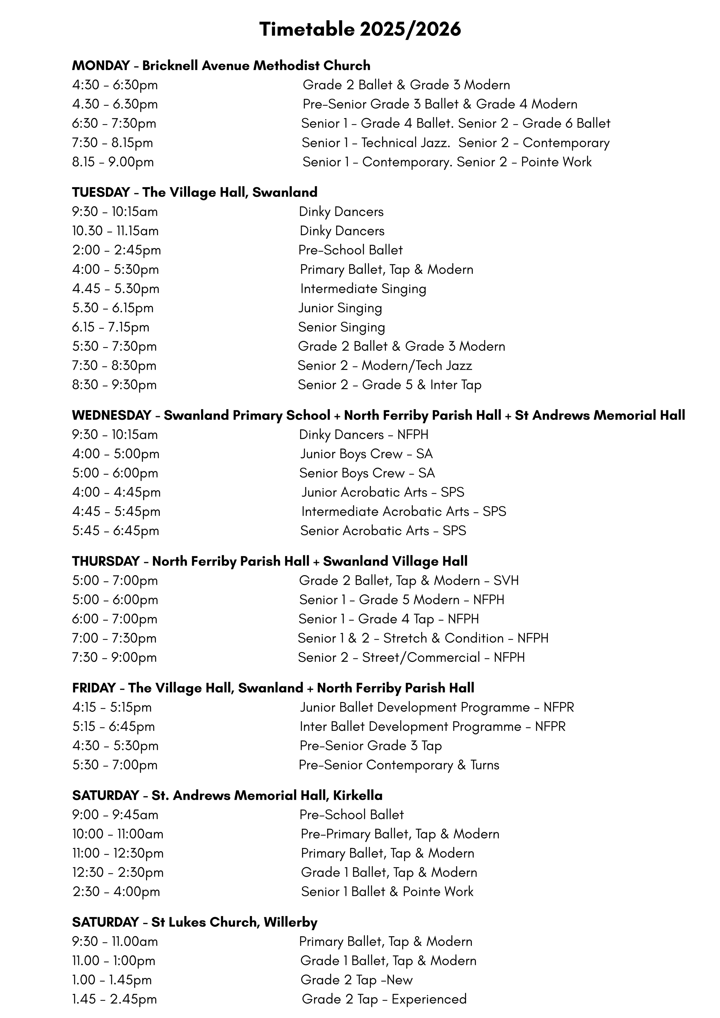 We stock much of the uniform making it easy for you to get what you need. Visit Miss Claire in the 'pop up' shop every Saturday at St Andrews Memorial Hall for fittings, purchases, and any uniform advice you might need. Ballet and Tap shoes can also be fitted and ordered. Miss Claire will be happy to help!